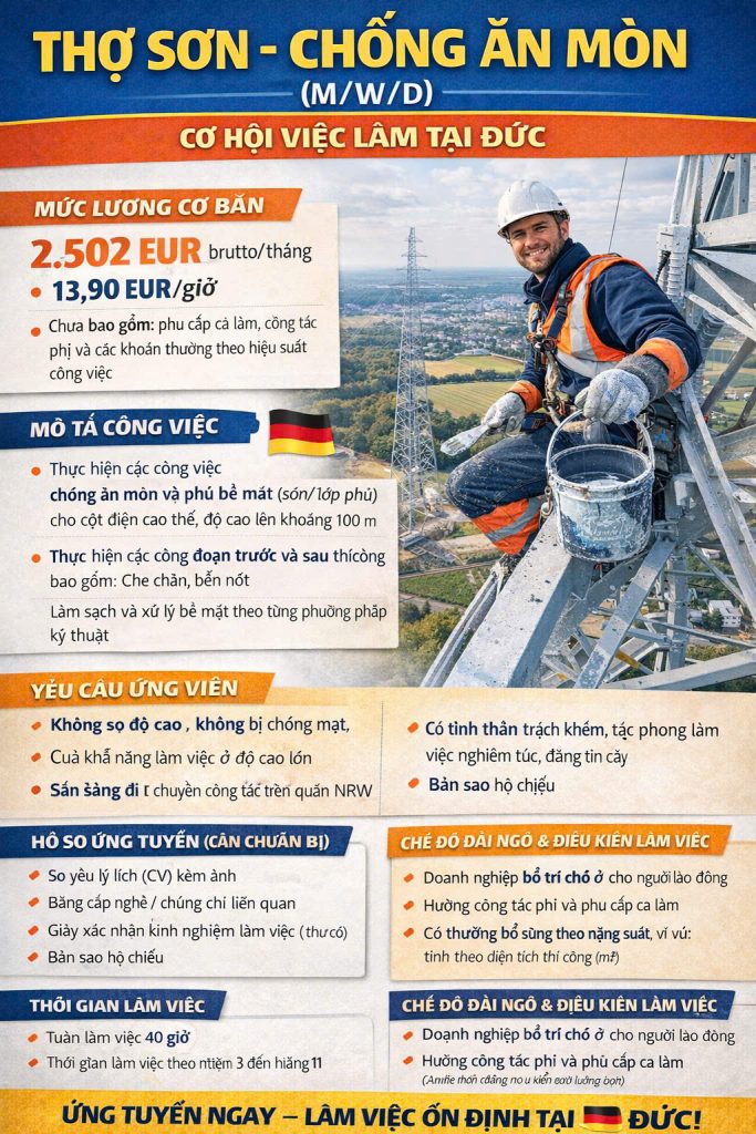 Đơn hàng thợ sơn cột điện cao thế tại Đức thường tuyển dụng lao động phổ thông có tay nghề với mức lương hấp dẫn, thuộc ngành công nghiệp kim loại. Yêu cầu chính bao gồm khả năng làm việc trên cao, chứng chỉ nghề sơn hoặc kinh nghiệm tương đương, và sức khỏe tốt.