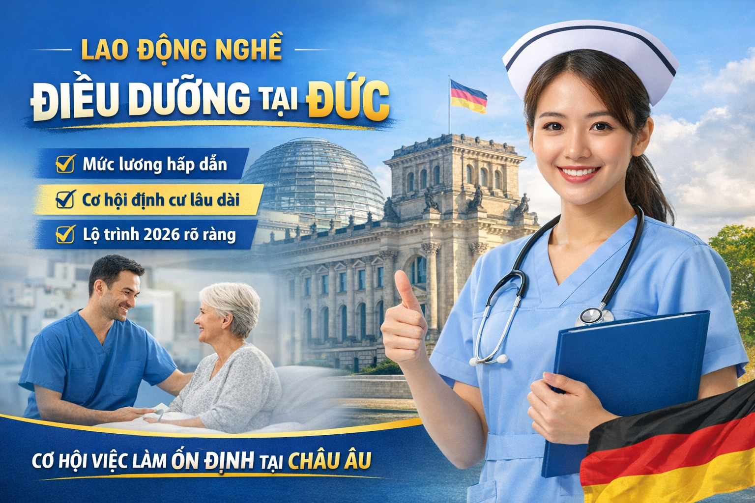 Lao động nghề điều dưỡng tại Đức đang là một trong những lựa chọn nghề nghiệp được nhiều bạn trẻ Việt Nam quan tâm nhờ mức thu nhập ổn định, nhu cầu tuyển dụng cao và cơ hội định cư lâu dài. Trong bối cảnh Đức đang thiếu hụt nhân lực y tế, đặc biệt là đội ngũ điều dưỡng viên, đây được xem là ngành nghề giàu tiềm năng cho những ai muốn phát triển sự nghiệp ở châu Âu.